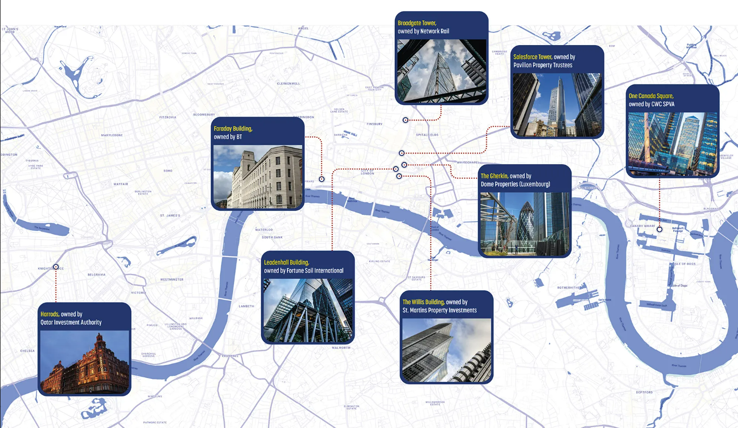 The map below (taken from Property Week) highlights several landmark London buildings and their respective ownership structures - including domestic institutions, international investors, and state-backed entities. This visual offers a snapshot of the diverse ownership landscape across key parts of central and east London.